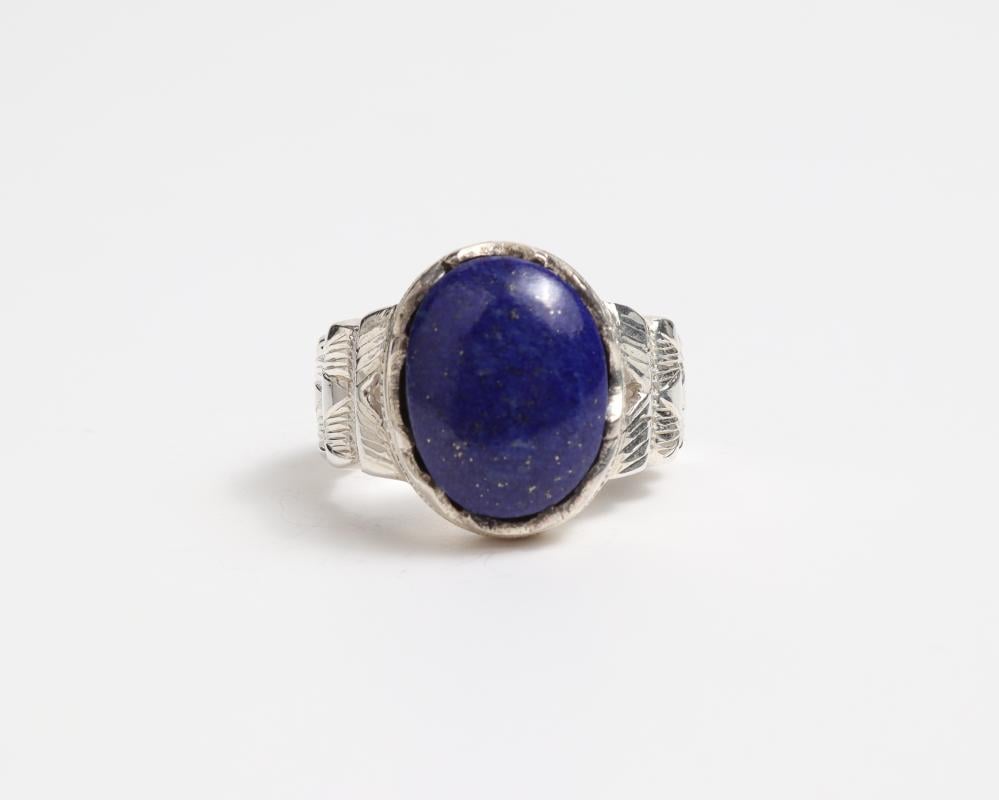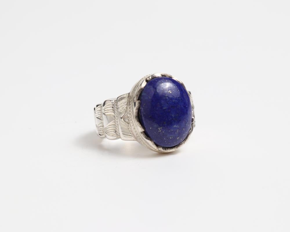 خاتم لازورد أفغاني طبيعي مصنوع من فضة عيار 950 وبصياغة بحرينية، يتميز بالحجر الأزرق العميق الذي يتمتع بلون رائع وتفاصيل دقيقة تبرز جماله الفريد.