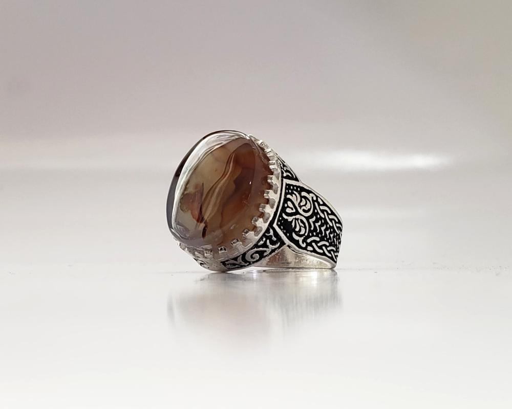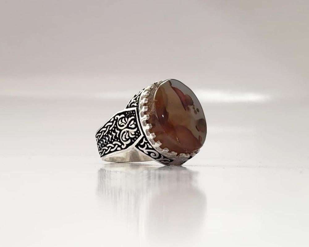 يتميز هذا الخاتم بحجر عقيق يماني طبيعي يمنحك إطلالة مميزة ولمسة من الفخامة، مع إطار مصنوع من فضة عيار 925 مزين بنقوش شرقية دقيقة تضيف له طابعًا فريدًا. تصميمه المتقن يعكس الأناقة والتراث العربي، ليكون خيارًا مثاليًا لمحبي الأحجار الكريمة والإكسسوارات الرجالية الراقية.