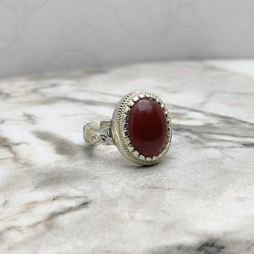 خاتم عقيق يماني كبدي مصنوع من الفضة المدبلة عيار 950 يُجسد مزيجًا مثاليًا من العراقة والأناقة العصرية. يتميّز بحجر عقيق يماني طبيعي بلون كبدي عميق يعكس الفخامة والرقي. الصياغة اليدوية الدقيقة تضفي على الخاتم طابعًا فريدًا يجعله خيارًا رائعًا للرجل الذي يبحث عن التميز في إطلالته اليومية أو في المناسبات الخاصة.