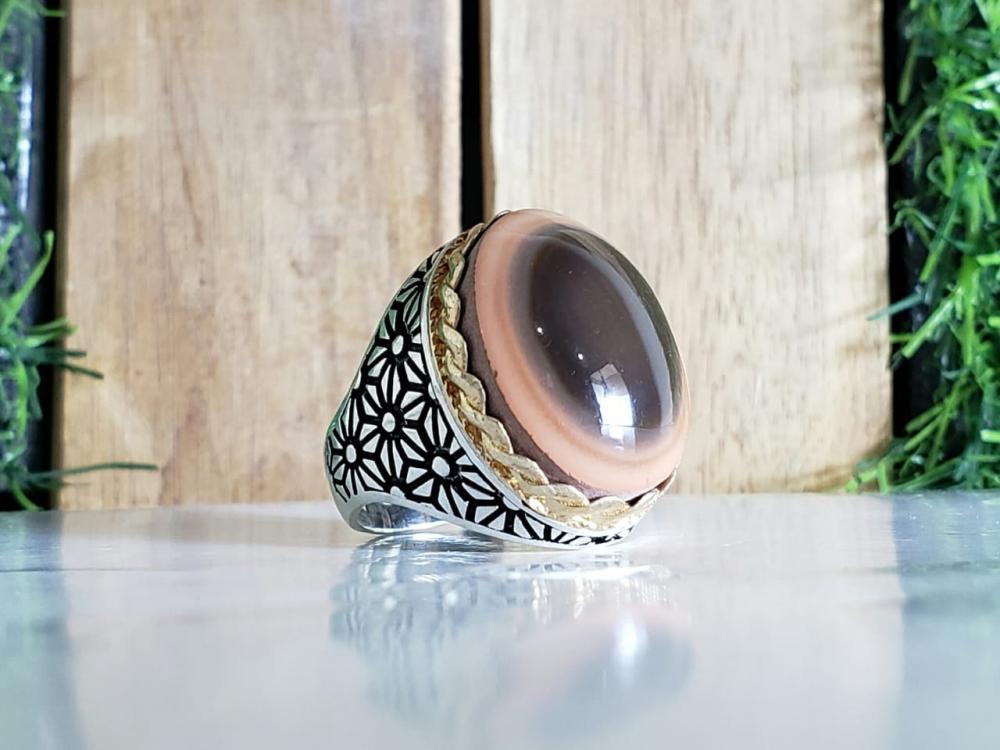 اجعل إطلالتك أكثر تميزًا مع هذا الخاتم الفريد المصنوع من العقيق السليماني اليماني الطبيعي، بحجم راهي مناسب لعشاق الخواتم الكبيرة والفاخرة. يتميز هذا الخاتم بتدرجاته اللونية المتناسقة التي تجمع بين البني والأسود بتصميم دائري رائع، مع إطار فضي محفور يدويًا بزخارف هندسية أنيقة ولمسات نحاسية تضفي عليه طابعًا فخمًا.
