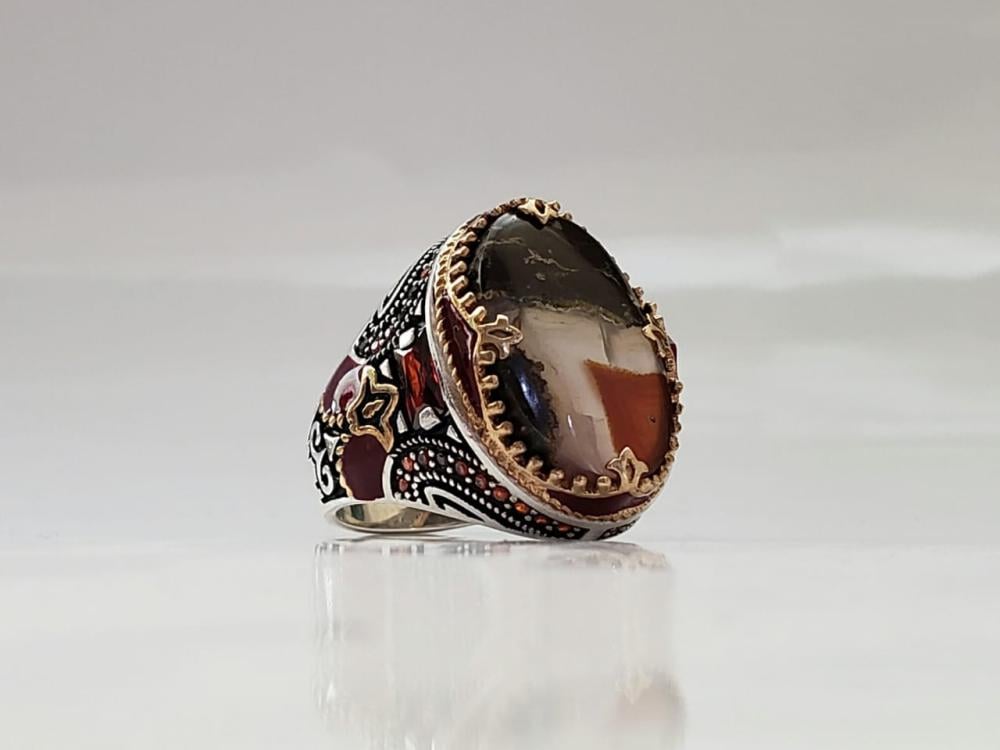 خاتم عقيق يماني فضة عيار 925 بصياغه فريدة مزينه بالنحاس ومرصعه بالزركون الاحمر