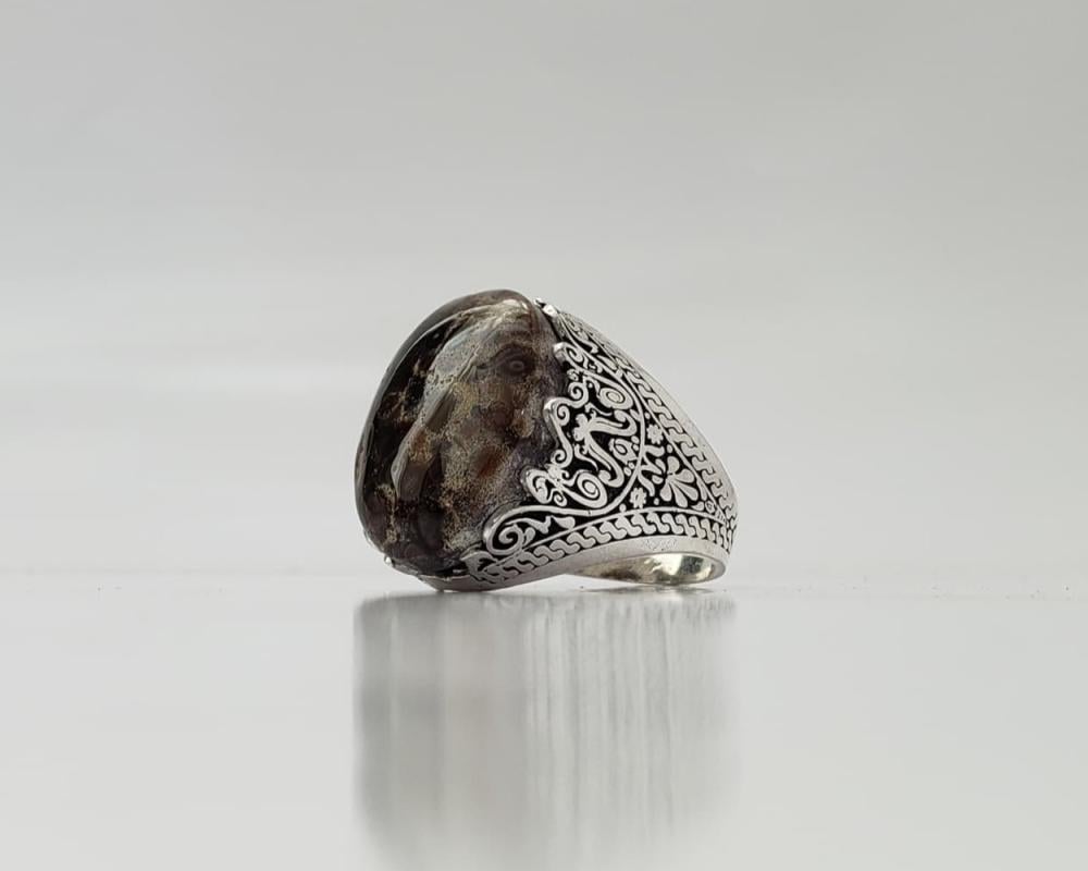 خاتم عقيق يماني مشجر بفضة عيار 925 – تفاصيل فنية مستوحاة من الطبيعة