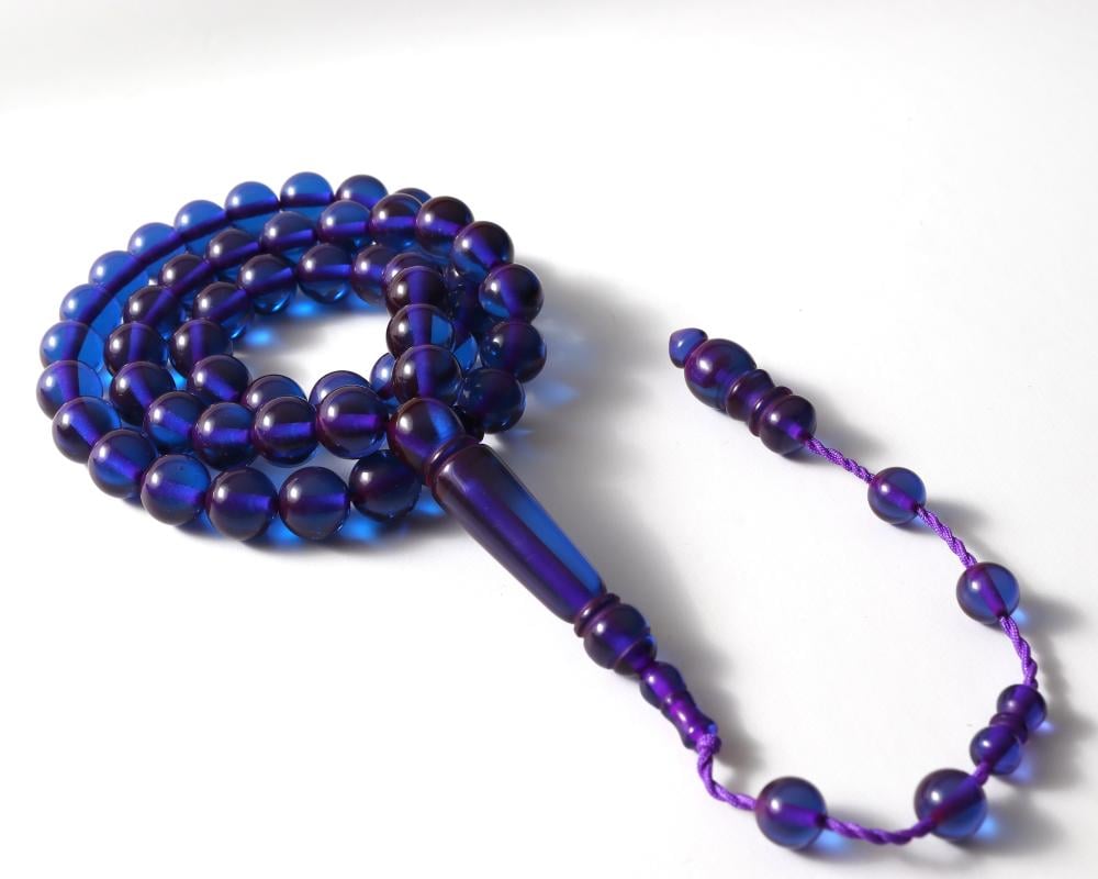 A luxurious chameleon purple Belgian Bakelite rosary with an elegant and unique design from Stone store, made from premium Belgian Bakelite in an attractive purple color that reflects sophistication and authenticity. The rosary features chameleon purple beads with a unique blue shimmer that changes with the light, giving it a distinctive artistic character and unique beauty. A strong purple thread enhances the design, with a harmonious pendant made from the same stone, adding a refined and distinguished touch. The rosary contains 51 carefully polished round beads, ensuring an ideal smooth and comfortable experience during use.